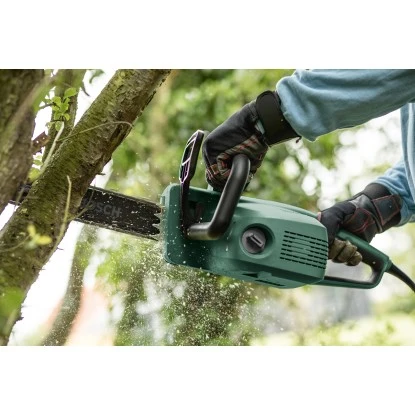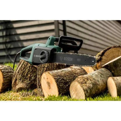 Die kabelgebundene Bosch Elektro-Kettensäge UniversalChain 35 hat ein geringes Gewicht von nur 4,2 kg und ist ergonomisch für optimalen Benutzerkomfort geformt. Ein leistungsstarker 1.800 W-Motor mit einer Kettengeschwindigkeit von 12 m/s sorgt für schnelle Schnitte. Boschs kompaktes SDS-System ermöglicht ein werkzeugloses und einfaches Spannen und Warten der Kette. Dank eines großen, seitlich ausgerichteten Ölbehälters mit gut zugänglichem Verschluss ist ein einfaches Nachfüllen des automatisch arbeitenden Kettenschmiersystems garantiert. Mit einer stabilen Rückschlagbremse zum wirkungsvollen Stoppen der Kette ist für die erforderliche Sicherheit gesorgt. Diese Kettensäge ist leicht zu bedienen und zu bewegen und daher ideal zum Sägen von Baumstämmen, dicken Ästen und kleinen bis mittelgroßen Bäumen.