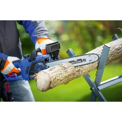 Dank des fehlenden Benzintanks, kann die Kettensäge durch Ihr geringes Gewicht punkten. Sie ist ausgestattet mit einer automatischen Kettenschmierung und einem Umlenkstern. Dieser gewährleistet eine optimale Haftung der Kette an der Führungsschiene und verhindert das Abrutschen der Kette. Das Vollmetallgetriebe macht die Elektro-Kettensäge besonders robust und langlebig. Der werkzeuglose Wechsel der Schneidgarnitur und der Überlastungsschutz bieten ideale Sicherheit.