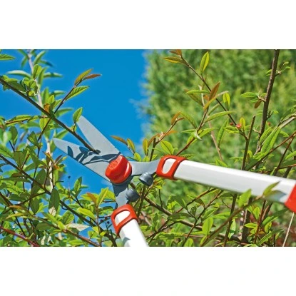 Des Weiteren garantiert der integrierte Astabschneider problemloses Schneiden von dickeren Ästen. Die langen Holme ermöglichen ein rückenschonendes Schneiden ohne Bücken in unteren Heckenbereichen sowie Schneiden von höheren Hecken. Die Heckenschere verfügt über präzisionsgeschliffene, geschwungene und antihaftbeschichtete Klingen sowie leichte Aluminium Designholme.